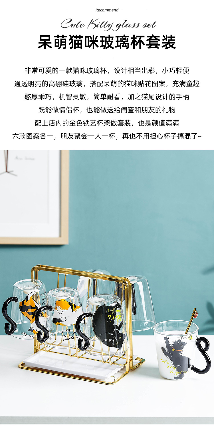 Net red cat cup home drinking cup heat-resistant belt glass cup creative ins milk cup couple cup 6 set